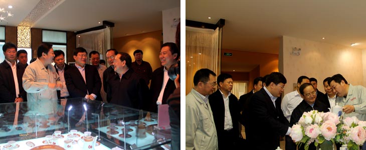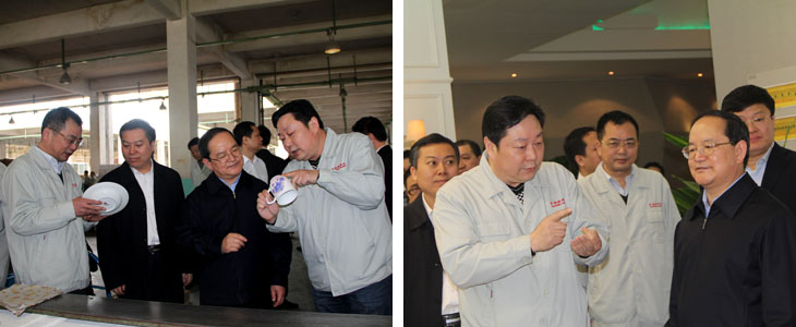 2012年4月6日江西省人民政府省長鹿心社一行在市委書記鄧保生、市長劉昌林等省市領(lǐng)導(dǎo)的陪同下來我司視察工作,鹿心社省長一行參觀了工廠生產(chǎn)車間、國瓷館,詳細(xì)了解了公司的生產(chǎn)運(yùn)營情 況并對公司產(chǎn)品贊不絕口。視察期間,鹿心社省長對公司給予了高度評價:“你們公司為景德鎮(zhèn)爭了光,為江西爭了光,為國家爭了光。"并希望公司能牢牢抓住精品路線,抓住高端市場,搞活機(jī)制,繼續(xù)做的更大更好。